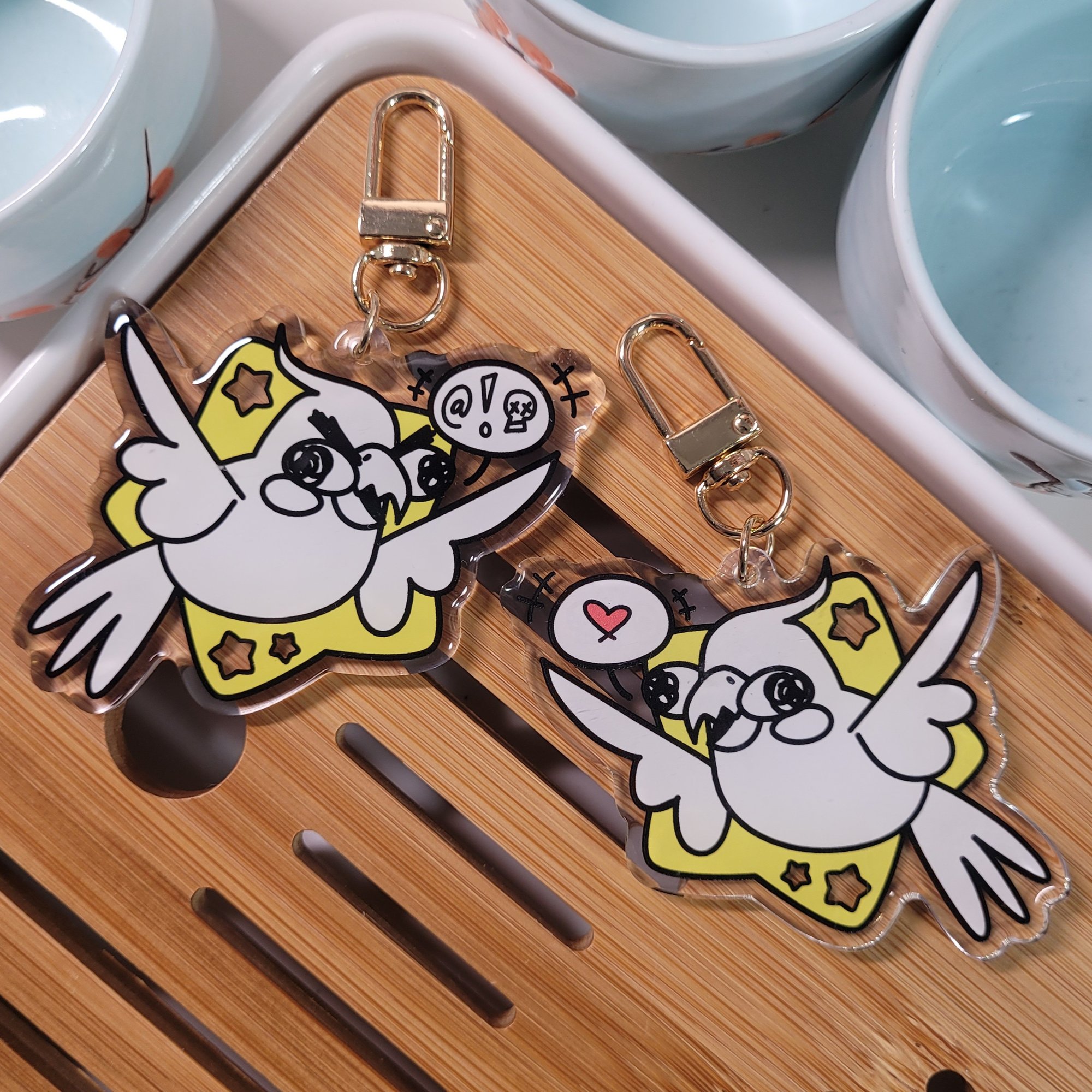 silly birb goobers illustrated by E - 2.5" charm - double-sided designs, different front and back - front side epoxy - gold clasp *final product colors may vary from images provided*